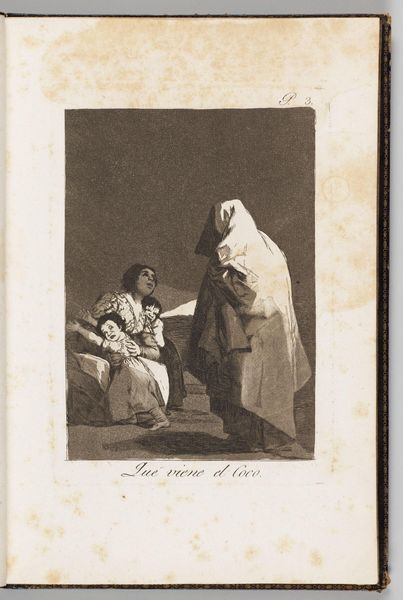 Curator: This etching by Francisco Goya, titled "Here Comes the Bogie-Man," presents an unsettling scene. What's your initial impression? Editor: Stark. The high contrast between the shadowy figure and the terrified family creates a mood of intense dread. Compositionally, the bogeyman dominates the scene. Curator: Goya was deeply critical of the social and political landscape of his time. "El Coco" was a cautionary figure used to frighten children into obedience. Editor: The aquatint technique gives depth to the shadows, really emphasizing the figure's ominous presence. The distortion of form is also key here. Curator: Absolutely. Goya uses this imagery to comment on the use of fear as a tool for social control. The church and state used similar methods. Editor: And the figures' gestures! The mother shielding her children, their wide eyes... it’s a masterclass in portraying raw emotion. Curator: Indeed, it's a powerful indictment of societal manipulation. Editor: The formal elements and the subject matter merge to convey a feeling of helplessness. Curator: A fitting end to Goya's potent social critique. Editor: Art as a mirror reflecting the dark corners of our world.