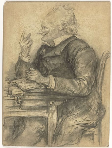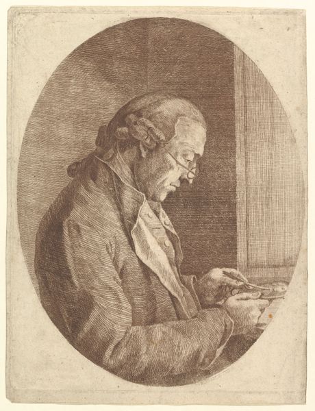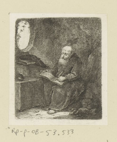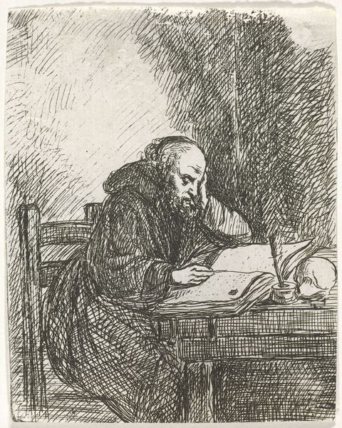 David van der Kellen created this etching of a reading monk in the Netherlands sometime in the mid-19th century. The image invites us to consider the place of religious study within Dutch society. The monk, identifiable by his tonsure and habit, sits absorbed in a large book, a skull and quill on the desk beside him. The skull is a memento mori, a reminder of death's inevitability, and the fleeting nature of earthly life. It’s a common trope in art history, particularly during the 16th and 17th centuries, though its revival here suggests a continued fascination with mortality, or perhaps a revival of older artistic traditions. Consider the social and political position of the Catholic church in the 19th-century Netherlands. The Dutch constitution of 1848 granted religious freedom, ending centuries of discrimination against Catholics. This etching may reflect a renewed interest in Catholicism, and in the contemplative life, within Dutch society. By consulting historical archives, religious studies, and art historical literature, we can better understand the complex interplay of religion, politics, and artistic expression in the Netherlands.