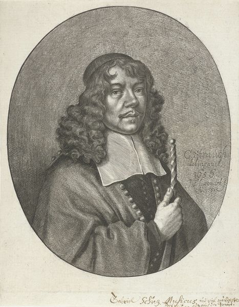 Curator: Here we have Reinier van Persijn’s 1644 engraving, "Portret van Ludwig von Siegen," currently residing in the Rijksmuseum. Editor: My initial response is quite intense! The high contrast, especially the dense hatching creating darker tones, produces a somber and weighty mood. Curator: Indeed. The density of the engraving work certainly contributes. Look closer, though. Von Siegen, though realistically rendered, embodies certain virtues central to the era, primarily regarding status and intellect. See how his dress suggests high rank, and the inscription celebrates the arts as ornaments? Editor: Yes, "Sunt Artibus Arma decori" or "Arms are ornaments of the Arts", an inscription that runs just below the portrait. The positioning is interesting –almost a barrier, solidifying him as a figurehead of knowledge and power through artistic achievement. How fascinating. Curator: Van Persijn employs the oval frame as more than just decoration; it's a symbol itself. Ovals often represented intellectual spaces during the Baroque period, underscoring the idea of Von Siegen's mind being an enclosure of profound thought and creative force. The portrait commemorates an innovator within printmaking. Von Siegen himself is credited as the inventor of Mezzotint, a technique utilized to produce tonality in prints. Editor: That absolutely reshapes my interpretation. Now, examining the composition further with your comment on innovation in mind...see how his eyes gaze intently. He confronts us directly. His likeness almost breaks through that formal boundary, conveying not just status but also an innovative presence challenging us as the viewer. Curator: The emotional quality then derives from an interplay. Van Persijn immortalizes his sitter through the meticulous process of engraving, establishing Von Siegen in cultural memory, his intellectual contributions now enduring as a symbol. Editor: Through its sharp contrasts and dense lines, what first appeared heavy transforms with your insights into a monument celebrating innovation through form, line and material—a subtle visual language embedding the concept of progress right into the very image itself! Curator: Precisely. The encoding becomes intrinsic to understanding the man’s significance. Editor: A valuable shift—recognizing symbolism is never simply decorative, it always works!