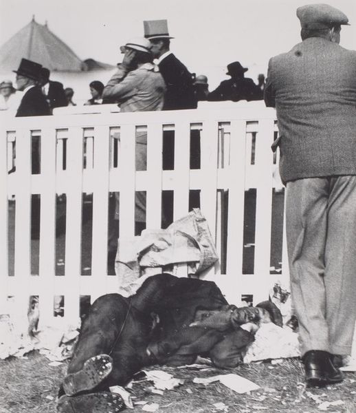 Curator: This photograph, likely taken between 1945 and 1948, captures the "Eerste nationale bevrijdingsfeest in het Olympisch Stadion: Juliana en Bernhard leggen krans," or the First National Liberation Celebration in the Olympic Stadium: Juliana and Bernhard Lay a Wreath, by Cas Oorthuys. Editor: It's an unexpectedly quiet photograph, considering the event it depicts. The vast stadium packed with people almost fades into a gray, indistinct background. The focus is drawn to the wreath-laying and the stark white cross dominating the scene. Curator: Quiet yet charged, wouldn’t you say? Oorthuys was masterful at capturing those everyday monumental moments. Think of it: the liberation still so fresh. It feels, looking at Juliana and Bernhard, like a very tender act. Editor: Definitely. But it’s layered. What does it mean to frame national identity with a massive religious symbol so soon after a war defined by ideologies? It prompts a lot of questions about inclusivity and the stories that get centered. Curator: True. The giant cross can seem almost…imposing now. And I agree about these layers. It's about collective memory and selective framing too. It reminds me of something Anne Carson wrote about the "blur of living." Editor: Absolutely. Photography always is. And look at the sheer mass of people behind them. I am thinking of Fanon and the crowd as a kind of revolutionary energy, but that kind of unified fervor can also be manipulated. Who gets to interpret the meaning of this moment, then and now? Curator: The photo reminds me a little bit of how we attempt to find the "right angle," not only literally for a picture, but in history, for memories... perhaps even a redemptive angle, but always through our limited perspective. Editor: Precisely, Cas Oorthuys gives us much to reflect on regarding nationhood, belief systems, and the role that public spectacles have to play when we negotiate shared memory and meaning after moments of seismic rupture. Thank you for your wonderful insights.