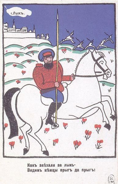 Kazimir Malevich made this print, "Soon, soon we will in Krakow", using simplified shapes and bold colors. You can really see the artist's hand in the outlined forms and flat application of pigment. It’s so different from traditional painting techniques that aim to disappear the artist’s process. The combination of the figures with their stiff spears behind the barrier, and the bold horseman looking to them creates a strange kind of tension in the work. The horseman is wearing bright red, with blue breeches and black boots. The white horse is delicately illustrated with the use of fine lines, but the bold colors used throughout really brings your eye to the subject. It’s a simple, but effective, composition. This image reminds me of some of Stuart Davis’s work with its bold lines and the use of simplified forms to construct a strong, graphic image. Malevich shows us that art isn't about imitation, it's about invention.