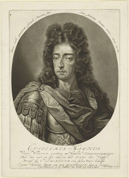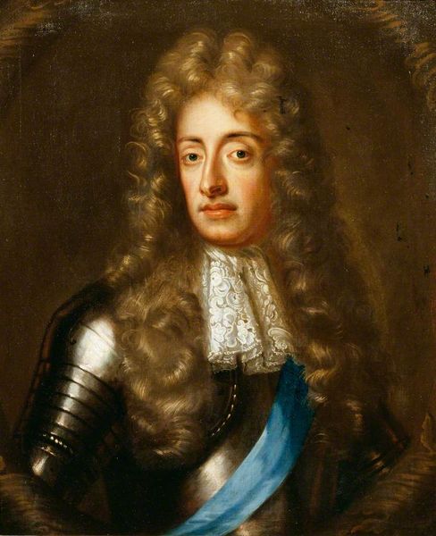 Editor: Here we have a portrait of James, Duke of York, who later became King James II, rendered in oil paint. It's undeniably opulent, even at first glance. The armor and lace… How do you interpret this work? Curator: From a materialist perspective, I am drawn to the stark contrast between the delicate lace and the cold steel of the armor. It speaks volumes about the societal structures of the time. Think about the labor involved – the painstaking work of the lacemakers versus the production of the armor, both reflecting specific social classes and power dynamics. The materials themselves become historical documents. Editor: That's interesting! I was just focusing on the visual contrast, but you’re right, it’s also about labor and production. Do you think Riley was intentionally highlighting those social aspects? Curator: Intentionality is difficult to prove, but an artist living in that society couldn't escape the reality of those contrasts. Riley, as a painter, relied on pigments, canvas, and brushes - each with its own origin and economic value. How might the specific pigments available to him at the time shape our perception of royal power? What about the availability, trade, and labor that was available for his art creation at the time? Editor: So, by examining the material origins of the painting itself, we gain a better understanding of the socio-economic context surrounding James II? Curator: Precisely! The painting becomes more than just a likeness of a king; it's a manifestation of the material conditions and labor relationships that underpinned his reign. It really encourages us to challenge traditional boundaries. Editor: That shifts my understanding entirely. I'll definitely consider this materialist lens when viewing other portraits. Thanks! Curator: It’s all about recognizing that even seemingly straightforward depictions can reveal complex material histories and social meanings. I will definitely remember your comments on the aesthetics of the painting as well!