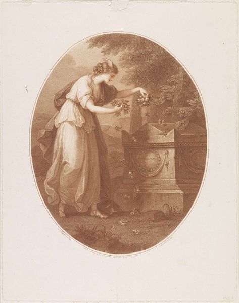 Editor: This drawing, made by Elizabeth Rigby, showcases a woman on a terrace. The medium creates a sense of subtle elegance. What do you see in the composition and the use of line? Curator: The structural arrangement immediately draws the eye to the figure, framed by the architecture. Note the interplay between the solidity of the columns and the flowing lines of the dress, a deliberate contrast. Observe how Rigby uses hatching to define form and texture. Editor: It’s fascinating how the sharp lines of the architecture contrast with the softer shading on the figure's gown. Curator: Precisely. It invites a formal reading of the artistic choices shaping our perception. Perhaps an exercise in tonal balance and visual counterpoint. Editor: I never thought about it that way. Curator: Considering the forms reveals much about the artist's intention.
