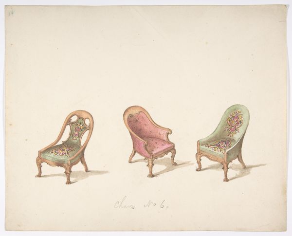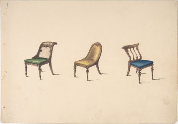 This sheet of chair designs was rendered with pen, ink, and watercolor by an anonymous artist. Although these chairs exist only on paper, the design details offer a glimpse into the culture of furniture making. The designs feature turned legs and backs, a technique where wood is shaped using a lathe. Imagine a craftsperson carefully carving away at the spinning wood, creating those elegant, spiraling forms. Turning was a common practice, but the level of detail here suggests a desire for something more elaborate, perhaps for a wealthy client. The choice of materials and the labor-intensive process speak volumes about the chair’s intended market. This wasn't mass-produced furniture, it was destined for a space where such displays of craftsmanship were valued. We might consider how the person who made the designs, and the person who would have made the chairs, related to the person who eventually sat in them. Looking closely at designs like these allows us to see past the object itself and appreciate the complex social and economic forces that shaped its creation.