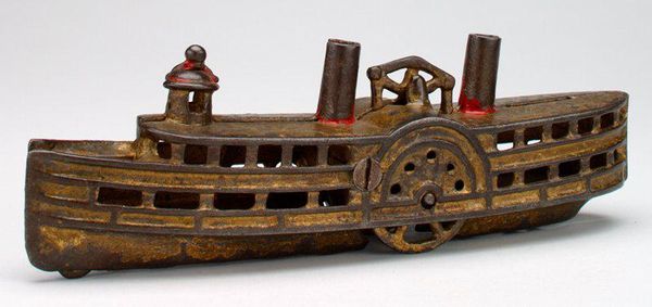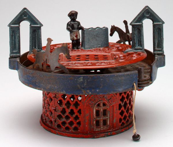 This is Professor Pug Frog's Great Bicycle Feat, a cast iron mechanical bank attributed to Charles A. Bailey. Though undated, it gives us a peek into the cultural landscape of the late 19th century. The bank presents us with a spectacle of entertainment featuring a frog on a bicycle, flanked by caricatured figures reminiscent of circus performers. These figures, with their exaggerated features and comical expressions, reflect the popular, yet often problematic, minstrelsy shows of the period. The racial stereotypes inherent in these shows were pervasive and normalized in American culture. Consider how such objects, designed for amusement, also perpetuated harmful representations. This bank, with its playful facade, invites us to reflect on the relationship between entertainment, cultural values, and the power of representation. It serves as a reminder of the complex and often contradictory narratives embedded within our material culture.