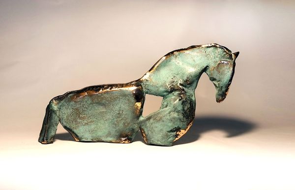 This small Mythical Horse was made by Amin Aghaei, who was born in 1982, from…well, it’s hard to tell what the base material is. But it’s been patinated, layered with color to give it a kind of dreamy effect. It makes me think about process, you know? The green and gold on the surface aren't just decorative; they're built up, creating this incredible texture. It's like Aghaei is not just sculpting but painting too. The way the green interacts with the gold, it makes the horse feel alive, like it’s breathing. And look at the way the light catches on those gold highlights, especially along the mane. It's like a secret language, hinting at the magic within the animal. This piece reminds me a bit of Marino Marini's horse and rider sculptures, but with its own mystical twist, suggesting how art is really a conversation between artists across time, each adding their own voice to the story.