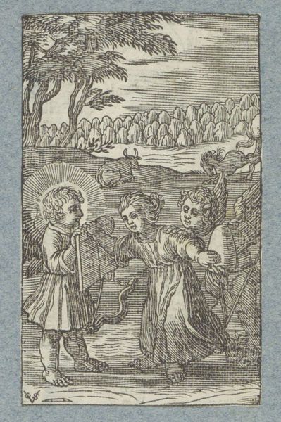 Christoffel van Sichem II created this woodcut, “Kind smelt onder de hete adem van engel,” during the Dutch Golden Age, a period marked by both immense artistic achievement and the harsh realities of religious conflict. The print depicts an angel exhaling on a child, causing the child to melt. The angel, with a halo and wings, embodies divine authority, while the melting child evokes vulnerability and suffering. This imagery reflects the pervasive anxieties of the 17th century, a time of religious reformation, wars, and the ever-present threat of disease. The act of melting can be seen as a metaphor for the way societal pressures and religious fervor could dissolve individual identity and innocence. Sichem, working within a society deeply shaped by Calvinist beliefs, may be commenting on the intense scrutiny and judgement of the time, where even the most vulnerable were not spared from divine wrath. The emotional resonance of this image lies in its stark portrayal of power and helplessness, a theme that continues to echo through contemporary discussions of social justice and human rights.