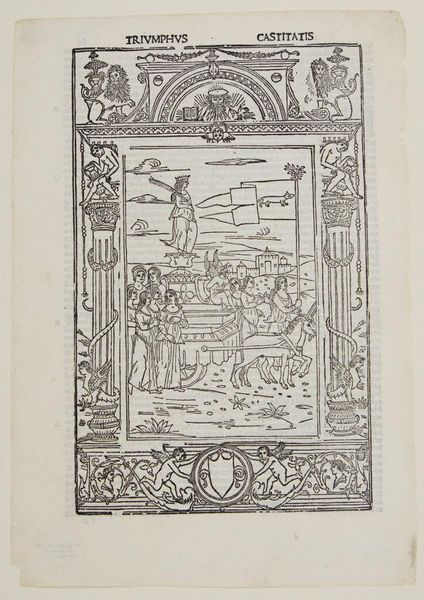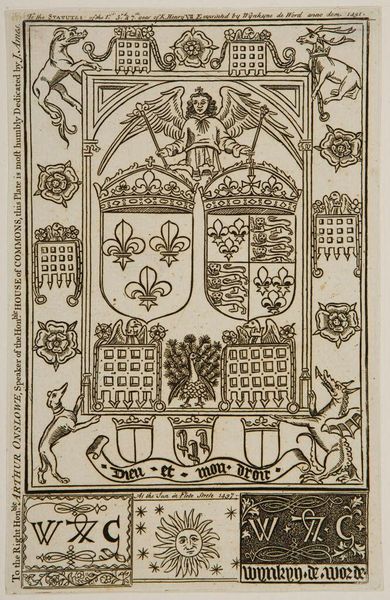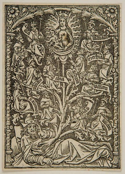 Curator: Here we have "Holy Trinity," an anonymous work held at the Harvard Art Museums. It looks to me like a visual representation of a hymn, with the Church Triumphant above and the Church Militant below, alluding to the Te Deum. Editor: Immediately, I'm struck by its density! Every inch is filled with figures, architectural details, and those swirling banners with text. It feels almost claustrophobic, yet grand. Curator: Note how the Holy Trinity, enthroned and flanked by saints, echoes traditional depictions of divine authority and the celestial hierarchy. The dove above them symbolizes the Holy Spirit, connecting the earthly and heavenly realms. Editor: And the architectural details of the church below are almost like a promise, a visual echo of the divine realm above. It creates a kind of symbolic bridge, doesn’t it? Curator: Indeed! The composition reinforces the relationship between the earthly church and the divine, emphasizing the importance of the Church as an intermediary and a reflection of God's glory. Editor: Looking at this piece has made me consider the power of visual representations of faith and collective aspiration. A compelling piece for contemplation. Curator: Yes, and a testament to the enduring power of symbols in shaping our understanding of the sacred and the secular.
