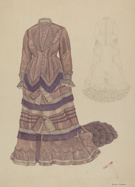 Sarah F. Williams made this costume design in watercolor, and you can really see her process in the layering of washes that give the silk taffeta its sheen. The rendering of the fabric has this incredible translucence, but then there's this opaque, matte patterning laid on top: Vines and leaves and dark clusters of grapes that look like they’ve been stamped on. Look how the sleeves billow and bunch and gather, it’s so luscious! There's a real tension between the flat, decorative elements and the illusion of depth and volume that she's creating with the modeling of light and shadow. It reminds me a bit of Matisse’s paper cut-outs, where he was trying to reconcile drawing and color and form all at once, collapsing the space between them. Williams is also doing this, only with fabric. It makes me wonder, did she sew? Maybe it’s an insight into her own design process, or maybe it's just a beautiful drawing that invites us to imagine other ways of seeing.