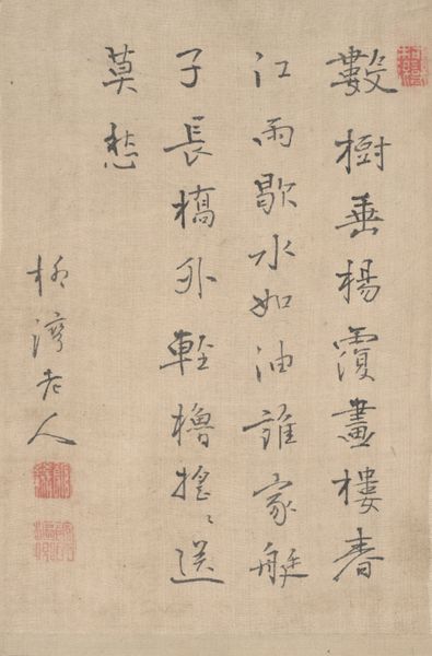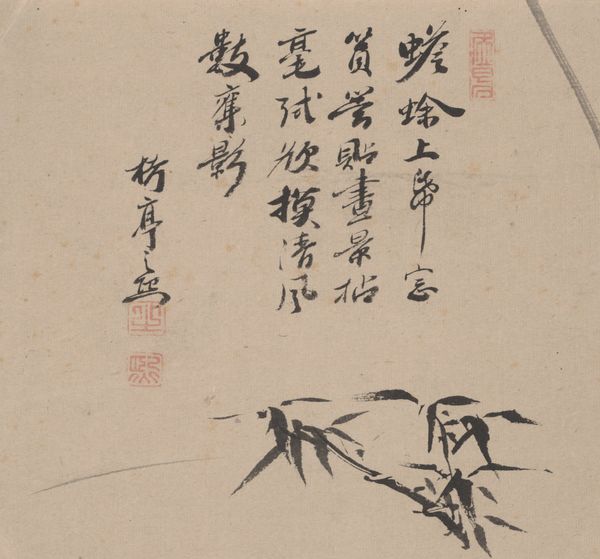 Editor: Here we have Tang Yin's "Ink Bamboo," created sometime between 1500 and 1524. It's an ink drawing on paper, and I'm immediately drawn to how delicate the lines are. It's so minimal, almost ethereal. What can you tell me about this work? Curator: Let’s think about the production of this piece. The availability of paper, the sourcing of ink - these materials weren't universally accessible, were they? This impacts our reading. A seemingly simple drawing represents an intricate network of labor and resources. The choice of ink itself – the processes, the techniques involved – speaks to the artist's deliberate engagement with tradition, with a highly esteemed medium. Do you think the calligraphic elements impact this material analysis? Editor: Definitely! I hadn't thought about how the text works as a material element, too. So it's not just what the bamboo represents symbolically, but also how the entire piece exists as a produced object? Curator: Exactly. Consider the socio-economic status it implies. Think about who commissioned the piece, for example. Did they own the paper mill? Knowing about production and consumption contextualizes the image beyond its aesthetic appeal. Even the act of painting with ink becomes a performance, imbued with history and social meaning. Where do we find the 'art' – in the image, or the labour that goes into creating it? Editor: I see. It makes you question where the artistry really lies, the finished product, or the whole system that allows the product to even exist. I’ll never look at ink drawings the same way! Curator: And hopefully consider how similar frameworks may challenge the very art we choose to examine in the first place.