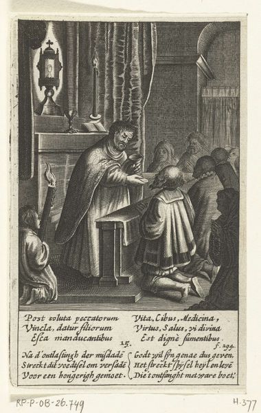 This engraving, titled "De communie, 15," comes from the Dutch Republic, and while the artist is anonymous, we can still learn a great deal by considering its materiality. The engraving process itself involves a forceful and disciplined working of a metal plate, to produce an image through controlled cuts and lines. In "De communie, 15," the contrast between light and shadow, achieved through these meticulous lines, gives the scene its solemnity. Look closely, and you can see the clear, deliberate work that went into creating the textures of the robes, the candlelight, and the expressions on the faces. Engravings like this one were produced in multiples, making them relatively accessible, and they played an important role in disseminating religious ideas during the Reformation. This work testifies to the skill of the engraver, while also speaking to the broader social and religious context of the time. It reminds us that even in the absence of a known artist, the materials and the act of making can reveal a great deal about the culture that produced an artwork.