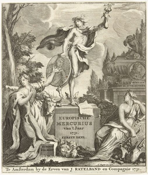 Curator: What strikes me immediately about this 1765 engraving is its intensity – it feels crowded, dramatic, and slightly unsettling. Like a tempestuous scene frozen in monochrome. Editor: It’s certainly evocative. This is the title page for the second volume of "Contemporary History of the Spanish," made by Reinier Vinkeles. We're looking at an allegory representing the narrative of Spain at the time. What we see are these baroque-style figures all swirling together. Curator: Baroque for sure – the dynamism, the chiaroscuro even in an engraving. Those enslaved figures, writhing and chained at the base... talk about a statement. But what is it actually saying about the Spanish? Editor: The standing female figure, she’s probably representing Spain, maybe as some sort of triumphant, if slightly melancholic, personification. She’s got a spear in one hand, an olive branch in the other, so peace and power maybe, balanced precariously. Behind her are all these other figures, presumably representing allies or other involved nations. And enslaved at her feet, those two chained figures, seem to symbolize subjugated peoples, and the chaos of war. Curator: Yes! And there's this odd mix of victory and tragedy playing out. Look at the mob raging behind her with swords in the air... There’s almost a bloodlust to it all. And then the distant ships at sea, all this tiny frantic detail makes it pulse. It definitely asks a lot of the viewer. Editor: Absolutely. And remember, this isn't just art; it's also propaganda. Printmaking was vital for spreading political ideas back then. So the engraver, Vinkeles, is using visual shorthand to create a very particular spin on Spain’s place in Europe and in global affairs at the time. It’s baroque visual rhetoric in action. Curator: I can see how it's more than just storytelling; it's an argument. A very layered argument. And maybe also an admission of guilt? Editor: I think it's fascinating how one image could condense a complex, controversial historical period and influence opinion using symbols, drama, and even visual tension. It’s a glimpse into the power of the printing press and the potent way art could shape public opinion during that era. Curator: It truly goes to show how seemingly straightforward historical illustrations often carry such an ocean of meaning within them. I leave this image contemplating about our understanding of history as viewers.