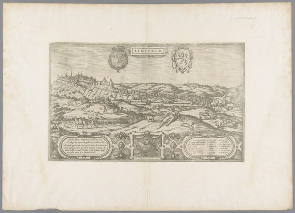 Frans Hogenberg made this print of Gezicht op Hoei in the late 16th century. It offers us a glimpse into the complex interplay of power, religion, and commerce that defined early modern Europe. The image creates meaning through its visual codes, cultural references, and historical associations. Made in the Netherlands, a region embroiled in religious and political turmoil, the print captures the social and political tensions of the time. Note how the cityscape of Hoei, dominated by its imposing castle, reflects the region's strategic importance. The inclusion of religious symbols and Latin text underscores the significance of religious identity in shaping social and political allegiances. It is crucial to explore archival materials, maps, and other visual sources to further illuminate the context in which the artwork was made. The interpretation of art is contingent on understanding its social and institutional context.