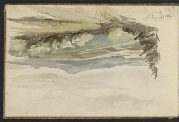 Johan Antonie de Jonge made this watercolor, Zeegezicht met het wandelhoofd Koningin Wilhelmina te Scheveningen, in the early 20th century. The muted tones, mostly greys and blues, give it a melancholic, almost dreamy quality. It really feels like a fleeting moment captured in paint, a memory fading at the edges. Look at how the washes of color blend into each other, creating soft, undefined shapes. There's a real sense of the artist letting the medium do its thing, allowing the water to carry the pigment across the page. That one darker patch on the right, it bleeds down the page, anchoring the whole composition. It's like a punctuation mark, a moment of emphasis in an otherwise fluid scene. This reminds me of Whistler's seascapes, where atmosphere and mood take precedence over detail. There’s a similar sensitivity to light and color, a desire to evoke a feeling rather than depict a scene with photographic accuracy. It's less about what's there and more about how it makes you feel.