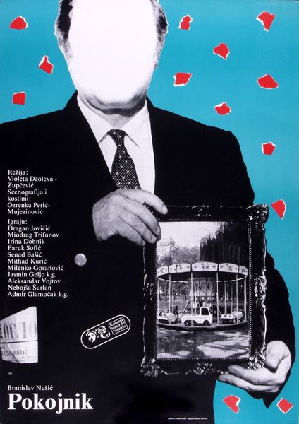 Editor: So, this is "Don Juan Comes Back from the War," a 1988 poster by Branko Bačanović. It's black and white, mostly graphic art it seems like, though there are some photographic elements. It definitely has a strange, almost unsettling vibe... like a dark fairytale. What do you see in this piece, with all its symbolism? Curator: The first thing that strikes me is the figure's mask-like head. It is animalistic but also technological, almost robotic, while its horns imply bestial virility, a symbolic juxtaposition reflecting the duality inherent in the Don Juan archetype. Look, too, at how the artist deploys small, scattered human figures throughout. What could they signify? Editor: Hmm, the figures almost look like they're falling, or floating away. Maybe lost souls or broken hearts? It contrasts the rigid suit and the almost robotic head. Curator: Precisely! The figure becomes a monument to detached seduction; the female statuette offered in his hand representing a debased objectification, amplified when set against a Kabare, itself a theatrical venue famed for erotic satire. All these visual vocabularies offer an immediate insight. It is striking to see how enduring mythical frameworks still operate in very recent history. Editor: So, by bringing together those iconic references of virility and desire, Bačanović critiques the timeless allure and ultimately the destructive impact of the Don Juan figure? Curator: Exactly. Its potency resides not just in the visual impact of symbolic motifs, but how effectively they critique society through the recognizable cultural narrative. Visual symbols like the horns become tools, and, by extension, powerful communication. Editor: It's amazing to think about how an image can pack in so much historical and cultural context. I’ll definitely think twice next time I see horns represented!