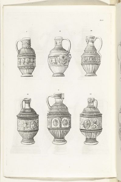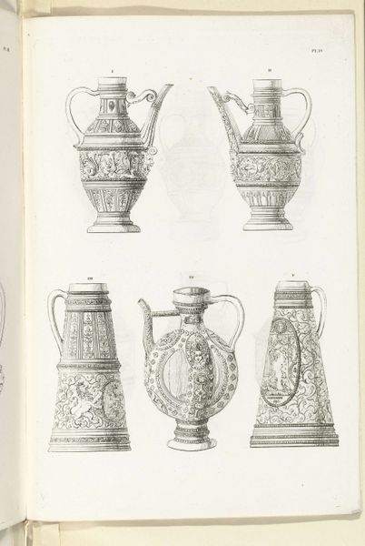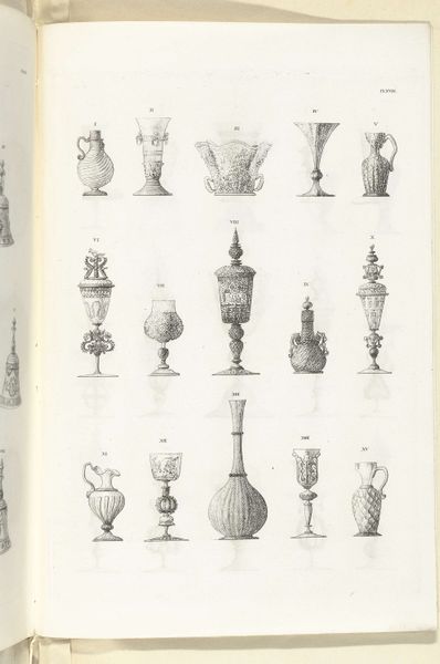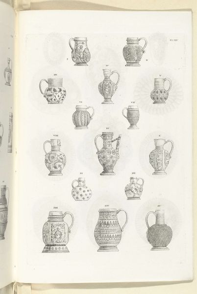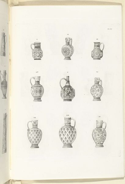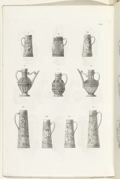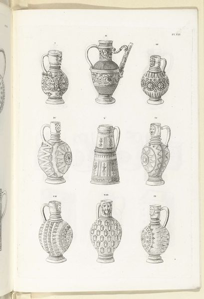 Editor: We’re looking at "Kannen van steengoed, plaat IX," a print made with ink, pen, and engraving on paper sometime between 1827 and 1829. Charles Onghena is the artist. The images show different stoneware jugs. I find the linear precision fascinating. What structural elements strike you most powerfully? Curator: Note the rigorous taxonomy at play, a visual system emphasizing minute variations in form. Each jug, carefully rendered, becomes a study in geometry and ornamentation. Observe how the artist’s linework meticulously articulates each curve and facet, prioritizing clarity of form. Do you perceive a hierarchy in the arrangement of these objects on the page? Editor: Perhaps the larger jugs at the top signify a progression, but honestly, they all feel equally important in their detail. The compositions vary so much from one to the next. Curator: Precisely. That subtle deviation highlights Onghena’s deep concern for aesthetic divergence within a controlled, systematic layout. Focus not on any intended narrative, but on the relationship between each jug’s structure, ornamentation, and its place in this visually compelling chart. The artist emphasizes contrasts and pattern relationships across the group. How do you see that informing the viewing experience? Editor: The formal structure is so compelling! Now that you point it out, I’m starting to see the arrangement as more than just a catalogue of objects; it's more about contrasting shapes, forms and surface designs against each other. Curator: Absolutely. The artist creates a dynamic play with forms, turning functional objects into visual essays on composition and structure. I appreciate your openness to the nuance presented here. Editor: Thank you for elucidating how each vase functions as a point of articulation for appreciating form.