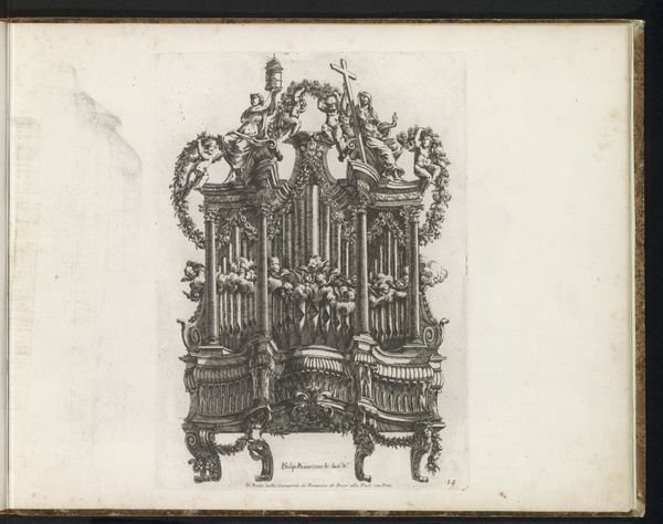 This is an altar design made by Filippo Passarini, rendered with ink on paper. It’s a sketch, not a fully realized object. But the lines tell us quite a lot about process and intention. Note how every element is carefully considered: the grand candelabras, the kneeling figures, the ornate carvings on the altar front. Each detail would have required significant skill and time to execute in three dimensions. The design suggests a world where labor is lavished on devotional objects, where even the most humble worshipper would be confronted with overwhelming beauty. The print medium itself is crucial here. It allowed Passarini to disseminate his ideas, becoming a template for craftsmen to follow, whether in wood, stone, or precious metals. The design would also have served as a demonstration of his own artistry, a portfolio piece, a calling card. By understanding the drawing in terms of its intended realization, we see how closely linked design, craft, and social aspiration really are.