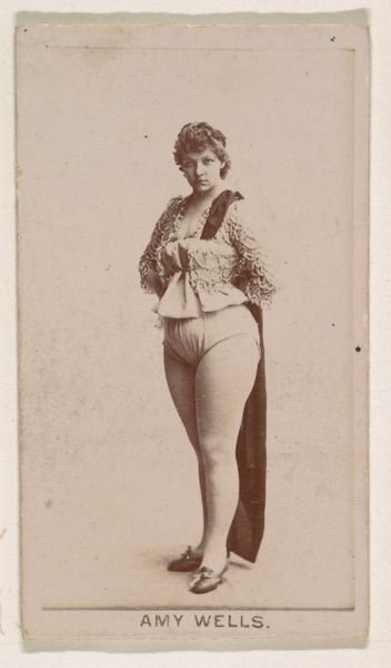 Editor: Here we have a print, a photograph, titled "[Actress standing in long cape], from the Actors and Actresses series (N145-8) issued by Duke Sons & Co. to promote Duke Cigarettes", dating back to around 1890-1895. What strikes me is the pose, the stark presentation against this warm sepia backdrop... almost theatrical in its artifice. What do you see when you look at this photograph? Curator: Formally, it's fascinating how the subject is presented within the constraints of the photographic medium of the time. Notice the limited tonal range, the subtle gradations that define form. It forces a closer consideration of shape, line, and texture. The folds of the cape, the lacework of the bodice... these details acquire a heightened significance, don't they? How do you feel the lighting influences your reading of the piece? Editor: Well, it’s definitely not dramatic. More like a soft overall wash. It softens the details and gives her a very even, almost abstract, appearance, especially considering how clearly her body is delineated otherwise. Curator: Precisely. This even lighting flattens the space and redirects our gaze towards the nuances of the surface: the texture of the paper, the slight imperfections, even the physical deterioration. These elements become integral to the artwork itself. It shifts the focus from mere representation to an engagement with the artwork as object. Editor: That’s a great point! I was focused on the figure but now I see how the material quality contributes. It becomes another layer to consider. Curator: Yes, the interplay of those layers is essential to understanding its aesthetic impact, and brings up questions about the nature of representation itself, especially in mass-produced items. Editor: Thank you, that was very insightful. Thinking about the formal qualities makes me consider the piece with greater appreciation.