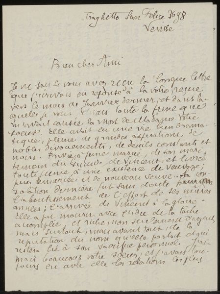 This is a letter to Héloïse Bernard-Bodin by the French artist Émile Bernard. While undated, the handwriting on graph paper offers a rare glimpse into the personal lives of artists during the late 19th and early 20th centuries. Bernard's letter creates meaning through his candid expression and the intimate act of handwriting. The use of graph paper, typically associated with mathematical precision, is in stark contrast to the emotional outpouring of the letter. France at this time was undergoing rapid social change. The Third Republic attempted to reconcile traditional values with progressive ideas, but in the realm of art, institutions like the Académie des Beaux-Arts maintained a conservative grip, valuing technical skill above subjective expression. This piece offers both a critique of such institutions and a move towards a more progressive form of expression through its rejection of traditional artistic conventions. Historians use letters like this alongside biographies, critical essays, and exhibition reviews to more fully understand the social conditions of artistic production. The meaning of art is contingent on such contexts.