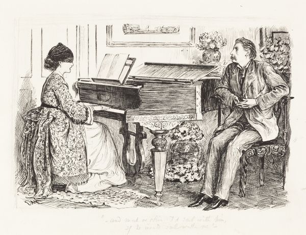 Theodore Robinson’s drawing, "At the Piano," captures a figure in quiet contemplation, rendered with graphite on paper. The composition focuses on the sitter, poised at a piano, her form softened by the medium’s inherent textural qualities. Robinson’s mark-making is quite evident; loose, expressive strokes define the woman's dress and the surrounding space, creating a visual rhythm that softens the edges of the forms. The limited tonal range of the graphite elicits a sense of intimacy. The artist's structural approach emphasizes the subject's interaction with her environment through shape and shading. The light catches the side of her face, focusing the viewer's attention and hinting at an internal narrative. There is an intersection between representation and suggestion at play here, reflecting a focus not on concrete details, but rather on the play of light and shadow, form, and emotion, resulting in a cohesive visual statement.