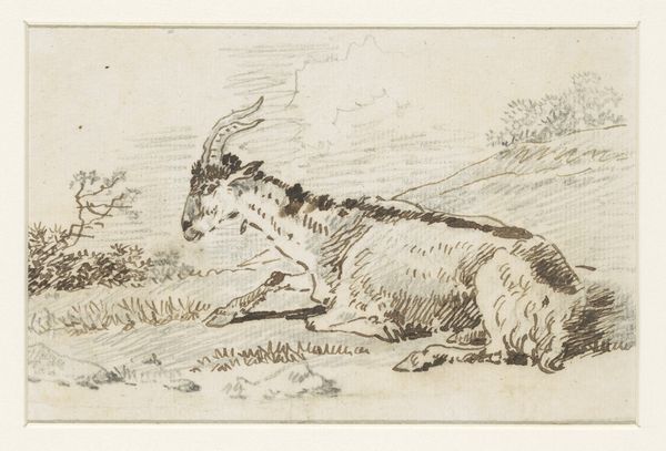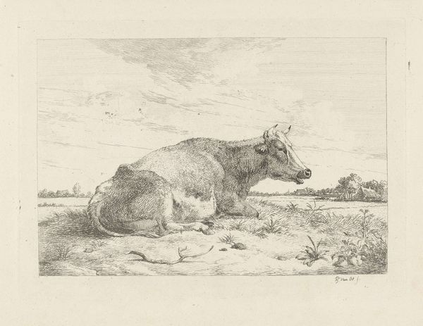 Curator: Standing before us, we have "Liggende koe", or "Lying Cow", an etching and print completed around 1851 by Jacobus Cornelis Gaal. It resides here at the Rijksmuseum. Editor: What a wonderfully serene image. It strikes me with its quiet stillness, that reclining form feels so substantial and present within the landscape, despite the muted palette. Curator: Indeed. Look at the exquisite cross-hatching used to delineate the form of the cow; observe how that meticulous technique provides dimension. Also, note the texture within the foreground, in direct opposition to the smooth gradation above it. Editor: The cow certainly seems to command the space here, doesn’t it? For centuries, the cow has acted as a vessel of nurturance and provision, becoming emblematic of fertility. Consider the ancient mother goddess figures, symbolized through bovine iconography... It asks us, what might the deeper symbolic weight of this single animal represent? Curator: I am drawn back to the visual and material components themselves. Observe how Gaal juxtaposes linear precision with atmospheric vagueness to produce this print; note how this piece reflects a specific trend toward realism present at this moment. How each discrete mark functions as a signifier that points to that greater trend and form. Editor: Don't you find the vulnerability striking? It suggests not only nourishment but perhaps even passive acceptance of fate—an emblem of sacrifice inherent in the role the animal holds. This image acts as an earthly anchor for broader themes that ripple across cultural consciousness. Curator: I am glad to consider these interpretations. But I maintain that without attention to its intrinsic, visual, and material properties, such semiotic explorations remain untethered, losing sight of how forms themselves inform meanings. Editor: Perhaps it’s through both avenues—a dialogue between the structure and the sign—that artworks like Gaal's reveal their potency, connecting both the visible and the symbolic. Curator: Well said. And so we invite you to reflect on these dual perspectives and the artwork as a totality.