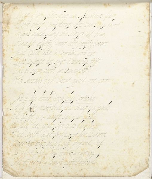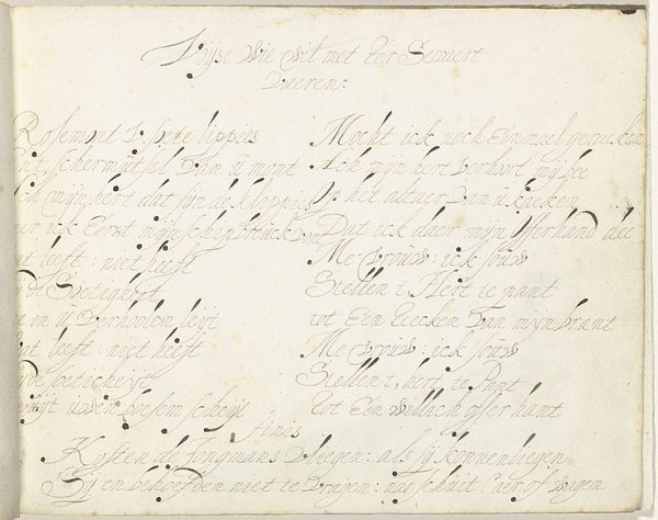 This page of calligraphy, titled "Liefdesgedicht" or Love Poem, was created by Gesina ter Borch, around the mid-17th century. Notice how the text meanders across the page, each line ending with ornate flourishes. This technique, reminiscent of illuminated manuscripts, evokes a sense of preciousness. The poem itself, filled with symbols of love, carries echoes of earlier traditions. Consider the use of the 'ligila' motif at the end of some verses. This could be compared to similar visual refrains found in medieval tapestries, where repeated patterns served to emphasize particular themes. We can see how such motifs, deeply embedded in the collective memory, have been used to evoke feelings of devotion and longing. The very act of writing, with its rhythmic strokes, becomes a ritualistic expression of emotion. The cyclical return to the 'ligila' motif underscores a timeless yearning for connection.