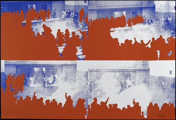Curator: Standing before us is Gerhard Richter's "Self Portrait Standing, Three Times, 17.3.1991," held in the Tate Collections, each panel around 50 x 56 centimeters. Editor: My initial reaction? It's like looking at a memory dissolving, a ghost of self in furious red. Curator: The red is striking, isn't it? Considering Richter's interest in the process of painting, the layering and scraping away become acts of revealing and concealing. Editor: It's violent, almost. The way the color smothers the photographic image… It feels like he's battling with representation itself, with the very idea of capturing identity. Is this what he felt? Curator: Perhaps. Or maybe it's about the limitations of the medium. The commodification of the image, its inability to truly grasp the complexity of the self. Editor: You know, the fragmented nature, the repetition... it makes me wonder about the self as a performance. Three attempts, none quite resolving. Curator: Ultimately, Richter makes you question what it means to represent yourself. It challenges our notions of selfhood and artistic production. Editor: Exactly, it's a rejection of easy answers. A restless, raw, and very human struggle captured on canvas.