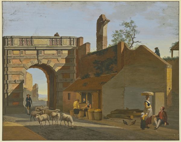 Job Andriaensz. Berckheyde created "Minervatempel, dabei eine Herde Vieh und Hirten" using watercolor and gouache. The painting presents a temple in muted colors, its architectural form softened by time, and a landscape that blurs classical grandeur with everyday pastoral life. Berckheyde’s choice of watercolor and gouache allows for delicate gradations of light and shadow, enhancing the gentle contrast between the temple’s stoic presence and the lively chaos of the animals. The architecture, though imposing, is rendered almost weightless, as the creamy textures draw attention to the surface quality of the work. This interplay between decay and vitality challenges the traditional reverence for classical antiquity. The temple, once a symbol of enduring power, is now a backdrop to a transient scene of herders and livestock. The artist seems to be questioning fixed notions of history and permanence, using form and composition to suggest that all structures, both physical and conceptual, are subject to change and reinterpretation.