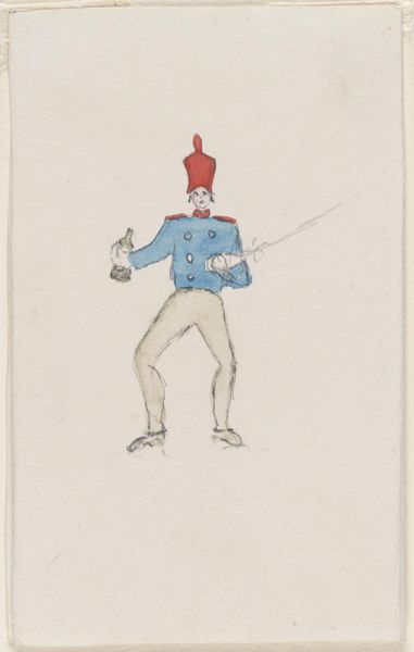 Curator: What a find! Rex F. Bush's "Cigar Store Soldier," dating from around 1936. It’s rendered in watercolor and portrays a figure with…well, quite the personality. Editor: Immediately, I'm struck by the almost cartoonish quality combined with the clear effort put into mimicking the soldier's uniform. The medium reinforces that tension – watercolor for something so closely linked with a traditionally masculine object, the cigar store soldier, is really intriguing. Curator: Absolutely. There's a blatant caricature at play, mocking not just the soldier, but arguably, the entire social role assigned to men in military service. The absurdity almost screams Dada. Consider the historical context: Bush created this in the midst of the Great Depression, with rumblings of war on the horizon. The piece questions what men were being sold, metaphorically speaking, as protectors and heroes. Editor: I'm keen on thinking about how the watercolor affects our experience. It’s almost like Bush is pointing to the impermanence of this "soldier," a mere object whose production involves readily accessible materials like watercolor paints and paper – demystifying this militaristic symbol. What kind of factory, studio, or workshop produced similar sculptures during the time? It forces a consideration of mass production, consumerism and gender roles. Curator: The choice to use watercolor seems purposeful. Watercolors inherently lack the perceived gravity or authority of oils or sculpture, underscoring this subversion of the military image. His academic background is at play here, with a satirical voice and commentary. Editor: Looking at the production of cigar store soldiers themselves, one finds diverse craft traditions, workshops engaging both trained artists and artisans specializing in the repetitive production of individual features on many identical figures, really pushing boundaries on "high" and "low" art distinctions of the era. This watercolour encapsulates similar social tensions that materialize across all artistic media. Curator: I find it intriguing how a seemingly straightforward caricature drawing prompts reflection on a multitude of interwoven themes related to masculinity, societal pressures, and militarism. Editor: It reveals the very structures of commodity production and identity in 1930s America, really making you rethink the meaning attached to commonplace materials like watercolor!