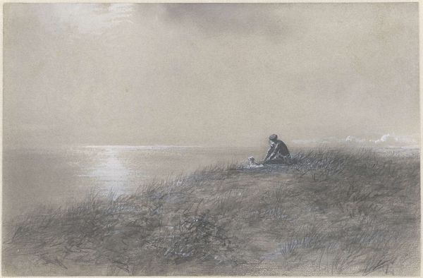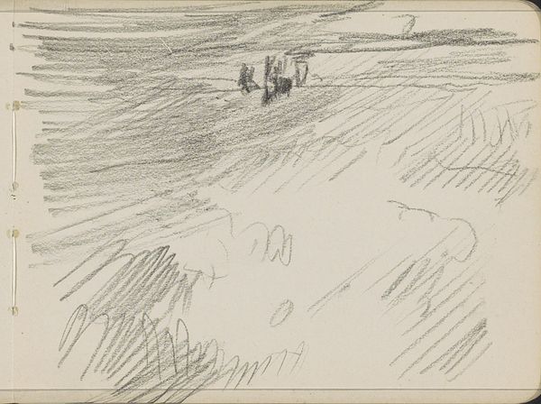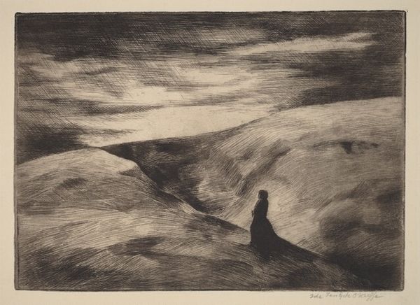 Curator: Well, first impressions: loneliness, definitely. Stark, silent. Editor: It certainly evokes that, doesn’t it? This is "Soria Moria Slott" by Theodor Kittelsen, created around 1911. He primarily used pencil and graphite. Curator: The grays and blacks are beautiful—they swallow everything! I feel like I'm standing at the edge of the world. He captures something so raw about solitude and landscape. I wonder if the choice of limited color helped emphasize such an eerie tone. Editor: Kittelsen was deeply interested in Norwegian folklore and the romantic nationalism that surged in the late 19th and early 20th centuries. The title refers to a gleaming castle, an ethereal utopia found in many Norwegian folk tales. Yet, here we see no castle, only a lone rider. Curator: Aha! That's what unsettles me. This tiny human on a vast journey—into the unknown. It feels almost...tragic. Soria Moria represents hope, and yet he pictures its pursuit like this? It’s interesting to imagine if, through the simple act of re-titling it "Solitude," how its cultural significance shifts, the perception, as well as the meaning behind the pencil strokes and shadings, alters the human reading! Editor: Precisely. By grounding this mythical quest in the somber realism of the Nordic landscape, Kittelsen speaks to the psychological weight of national identity and utopian longing. What does it truly mean to seek paradise, and what is the cost? I appreciate how you said how Kittelsen emphasizes the importance of considering its relationship with the environment, as it serves as the setting and backdrop to his symbolic storytelling through this very romanticism artwork style. Curator: Right! So, it's like Kittelsen is asking: "What is hope really, if it requires an arduous path and such solitude?" It gives me chills to ponder that! Thank you. Editor: A perfect painting to explore. Always rewarding to see how such deceptively simple drawings contain multitudes.