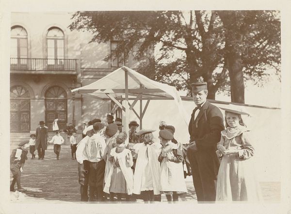 Editor: This is an intriguing gelatin silver print, titled "Man with child in Sumatra, possibly Eiso Bergsma and his daughter Netta," dating from around 1925-1929. The high contrast between light and shadow creates a somewhat unsettling feeling despite what looks like a social gathering. How do you read the composition of this work? Curator: From a formalist point of view, the composition strikes me with its spatial arrangements and tonal distribution. Note how the anonymous photographer utilizes a shallow depth of field. The sharp focus on the figures in the foreground draws our attention to their relationship, which exists almost as an intrusion into the space of an elite gathering. Observe the repeated, rigid forms versus the relative naturalism of the man and child; how does that tension contribute to the work's effect? Editor: It feels a bit like the photographer captured a moment that might be a formal public gathering but the child seems out of place among the grown-ups in hats. Almost like they walked in on it. Is that spatial relationship meaningful? Curator: Indeed, it begs questions about societal positioning. Consider the textures and shapes – the dark, solid hats contrasting with the girl's softer clothes, and how that juxtaposition might offer an interpretation of status and social structures within colonial Sumatra. What assumptions does it allow? Editor: The way the people in the background look similar because of their all white clothing compared to the other two... I guess the meaning would change based on if this were a casual snapshot or a planned pose. I had assumed it was happenstance! Curator: Precisely! Without explicit contextual data, we analyze formal elements: line, shape, texture. This brings an alternative viewing experience beyond a surface, narrative one. Editor: That’s really interesting! Focusing on those elements gives me a fresh perspective on how photographs of this period portray class differences and their complex relationships. Curator: And it reminds us of the importance of a purely visual, and sometimes philosophical, approach in decoding the language of art.