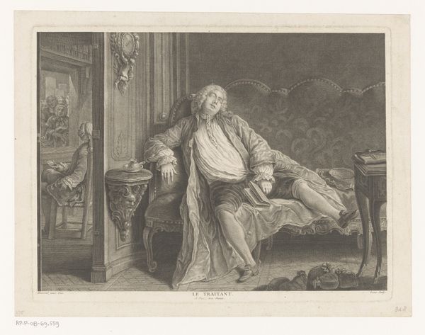 Curator: This is Benoit Louis Prevost's engraving, "Man Behind a Writing Table", made in 1763. It seems a fellow has succumbed to slumber amidst his studies. What springs to mind for you when you see this, Editor? Editor: Exhaustion! The universal artist's lament perhaps? Or maybe an exhausted politician – I find my attention drawn to the context: the materials used for the print, where it might have been consumed. Is it meant as social critique? Curator: Maybe, though, on first impression, it feels more sympathetic. His books, his globe... these aren't props. It's an environment crafted to hold thought, and it has overwhelmed him. What intrigues you about its materiality? Editor: The lines, of course. Consider the engraver's labour. Every mark deliberately placed on that copper plate; an arduous task multiplied across potentially hundreds of prints. Who commissioned this? Was this printed for popular consumption, or a more elite circle? What paper was used? It tells a story of access. Curator: Interesting! I immediately looked into his private moment as portrayed in this picture... and that room, bathed in a muted indoor and outdoor light, has to do something with class and privilege, don't you agree? Editor: Absolutely, and let’s remember this is a reproduced image. The distribution makes the labor question really important here. How was this image seen, shared, or consumed in a context far from its original creation, potentially recontextualizing the subject itself? Curator: Good question! Maybe this image of him can be also about how much it is required of certain people at this certain time in history, about all this work and all those social functions of aristocracy... all a source of exhaustion, just as real as any other labor that goes into the making of those drawings! Editor: A compelling thought – collapsing high-minded contemplation into mere "labor" certainly punctures some aristocratic ideals. Ultimately, for me, the process reveals so much about this historical moment's values and systems, extending beyond simply aesthetics or narrative. Curator: For me, I will retain the melancholy of its lines, light, shadows that talk of dedication and commitment, and quietude. A nice invitation for self reflection... Editor: A lovely closing thought, Curator, on an etching as evocative as this one.