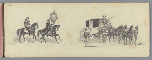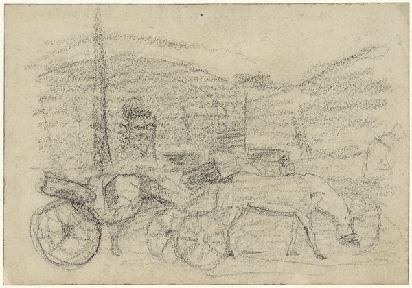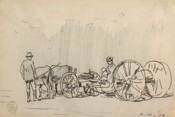 Editor: This is Friedrich Gauermann's pencil sketch, "Loaded Wagon," from the early 19th century, housed at the Harvard Art Museums. It feels transient, like a moment captured in time. What symbols or meanings do you find resonating within this simple sketch? Curator: The wagon, a vessel of both travel and burden, carries echoes of journeys, migrations, and the weight of possessions. The wagon itself is like a portable home, suggesting themes of transience and the human need for shelter and security. Do you see how the sketchiness adds to that feeling of fleeting movement? Editor: I do. The lack of firm lines emphasizes the temporary nature of the wagon's stop. It also speaks to the past, and how we carry the past with us. Curator: Exactly. It reminds us that images carry cultural memory and continuity; the wagon, in its simple form, embodies layers of history and human experience. Perhaps we all carry our own "loaded wagon" of experiences. Editor: I never thought of a wagon carrying history itself. This was insightful, thank you! Curator: A pleasure. It's remarkable how much meaning can be drawn from simple lines.