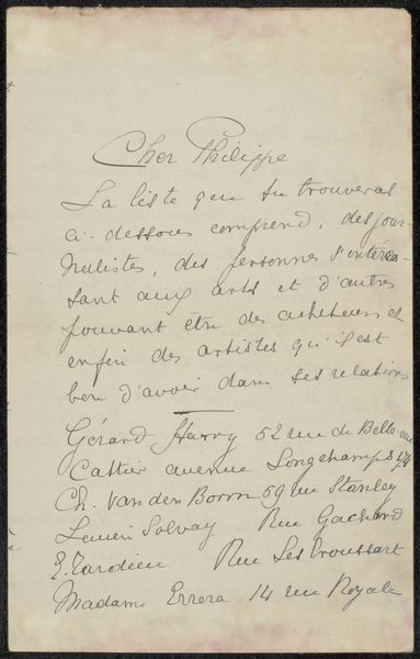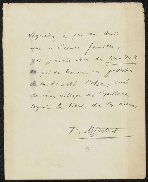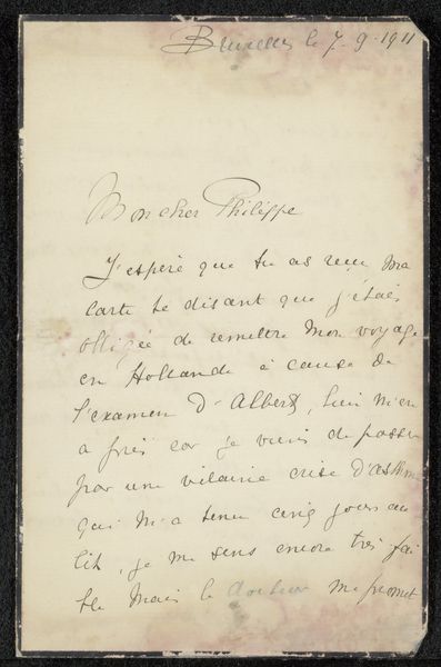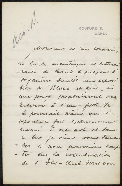 Editor: So, here we have "Brief aan Philip Zilcken," which translates to "Letter to Philip Zilcken." It’s thought to be from somewhere between 1913 and 1928, by Hélène van Goethem. It's ink on paper, a drawing with beautiful calligraphy, like a portrait of words. It feels…personal, you know? Intimate. What strikes you most when you look at this piece? Curator: The script itself dances, doesn't it? It feels almost alive, a direct conduit to the artist's thoughts and feelings. Calligraphy, especially, it's like watching someone’s soul move across the page. I get lost in wondering, who was Philip Zilcken? What was so important that she poured this out in ink? It’s interesting how seemingly mundane, everyday writing transforms into art simply because we are viewing it in this setting. I can almost imagine Hélène hunched over a desk, her brow furrowed in concentration as she formed each letter, do you get that too? Editor: Definitely! You can almost feel her presence. The imperfections make it feel authentic. It makes me wonder about their relationship…the specific 'embarrassment' she refers to regarding a question, the artistic circles… It’s like a tiny glimpse into a whole world. Curator: Exactly. The unfinished thought gives us freedom to imagine. Isn't it amazing how such a simple medium like ink can capture so much about a time, a person, a relationship? These little portals can be as evocative as any grand painting. It is almost as if it’s unfinished to the viewer as we continue to wonder, ‘What does it all mean?” Editor: I never thought about handwriting being a medium itself, like drawing or painting. Curator: Well, isn't everything an art form, in some way? We only need to train our minds and eyes. I’ve certainly developed a new appreciation for snail mail!
