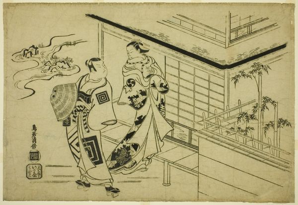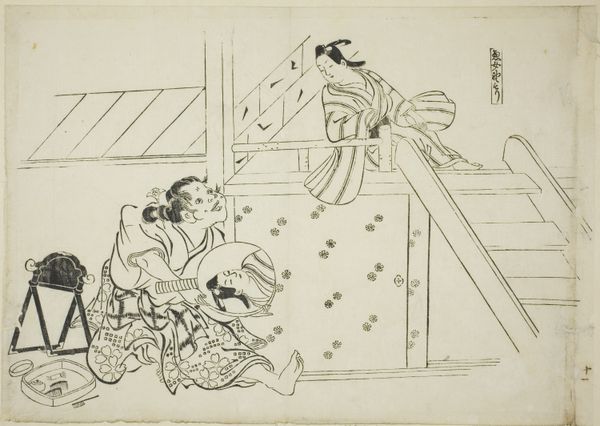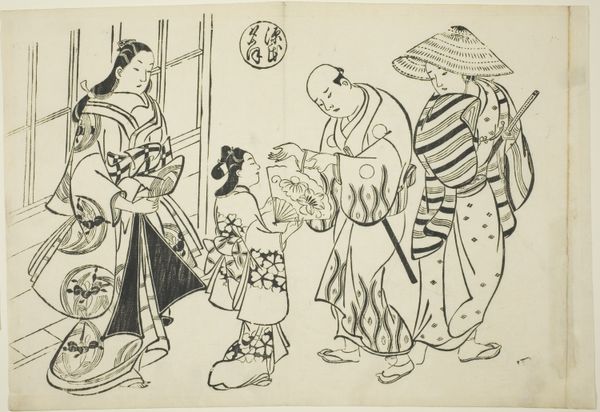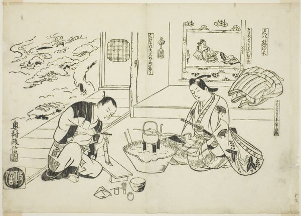 Editor: Here we have "Sanbaso Dance in a Brothel," a print by Okumura Masanobu, dating from the late 1710s or early 1720s. The monochromatic style, the focus on the figures, and the tile floor – it gives it a theatrical feel, almost like a stage. What’s your interpretation of the figures in the scene, and the way they’re positioned? Curator: It feels as though we are peering into a dream, doesn’t it? I wonder if Masanobu chuckled to himself while drawing this. See how he elevates something sacred like the Sanbaso dance – traditionally performed to pray for good harvests – and plops it down in a pleasure house! Perhaps this is a sideways glance at the rigid expectations of Edo society, wrapped in layers of wit. Do you notice the subtle details, like the faces? Editor: They're pretty expressive, especially the woman in the center with the fan. Curator: Indeed. Masanobu isn't just copying reality; he's giving us the mood of it. And the "mistakes"—are they errors or winks? Art, at its finest, isn’t about answers, but better questions. Makes you wonder if art like this could spark rebellion in an uptight society, right? Editor: I never really considered the potential subversive element of art like this before, especially back then. It's made me look at it a different way now. Curator: That's the wonderful thing about art; a fresh angle can turn the familiar into something unexpected. Remember this playful print next time someone tells you history is boring! Editor: Definitely something to ponder. Thanks for illuminating this piece!