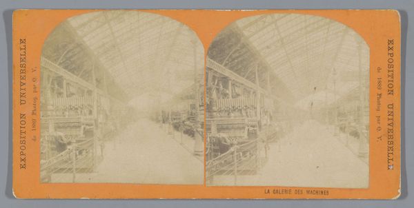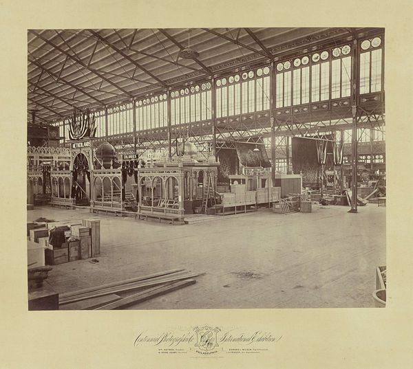 Editor: This albumen print by Neurdein Frères, taken in 1889, depicts the Palais des Machines during the World's Fair in Paris. The scale is just breathtaking! It almost feels like peering into a cathedral of industry. What strikes you when you look at it? Curator: I am immediately drawn to the interplay of light and structure. Observe how the photographer utilizes the vast, arched ceiling—a marvel of engineering itself—to create a network of lines. Notice also that it draws the eye toward a vanishing point. The light, filtered through the glass, softens the industrial rigidity, imbuing the scene with a kind of ethereal quality, wouldn't you agree? Editor: Absolutely! The light softens what could have been a very harsh image. How do you think the photographer’s choice of perspective affects the viewing experience? Curator: By choosing a panoramic viewpoint, the photographers capture the sheer volume of the space and machinery. This creates a sense of awe, doesn't it? And that vastness hints at the boundless potential of the industrial age. Furthermore, look how the elevated vantage point allows us to comprehend the complexity of the layout, almost as if we are granted privileged access. Editor: It’s interesting how the image balances both grandeur and intricate detail. What would you say is the focal point of this work? Curator: Rather than a single focal point, the photograph cultivates an overall sense of rhythm through the repetition of forms—arches, beams, machines. This establishes an all-encompassing pattern, almost mesmerizing in its complexity. It refuses a hierarchy of elements, instead proposing a unified vision of industrial progress. The picture plane acts as a two-dimensional window, allowing us insight into the very structure and rhythm of a changing world. Editor: That’s fascinating, I hadn’t considered the "rhythm" before. Thank you. It definitely gives me a fresh appreciation for its artistic choices and visual impact beyond just documentation. Curator: My pleasure. These considerations around form and structure truly unlock so much in works like this, no?