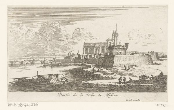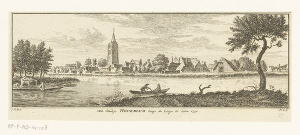 Editor: Here we have Caspar Jacobsz. Philips’ “Gezicht op Acquoy,” an engraving from sometime between 1740 and 1760. It's a charming scene, but almost… staged, somehow? What do you see in this piece that I might be missing? Curator: The image acts as a visual document, presenting an idealized vision of Dutch Golden Age life, a very intentional and loaded viewpoint. Consider how the church, centered and prominent, isn't simply a building, but an enduring symbol of stability and spiritual continuity. What feelings does that evoke? Editor: I guess it feels peaceful, and established. So, even without knowing the specific history, that towering church shape is meant to inspire those feelings of tradition and order? Curator: Precisely. The waterway too, meticulously rendered, suggests a vital artery of commerce and connection, but also speaks to the Dutch mastery over water, a powerful cultural narrative. It implies both prosperity and safety for its denizens. How might that impact someone viewing it then versus today? Editor: Interesting! Today we might see it as quaint, but back then it was reinforcing a particular image of national identity and values. The details matter too – the figures going about their lives in such harmony! Curator: And don't forget the symbolism of light! Notice how Philips uses light and shadow to create a sense of divine blessing upon this ordered scene. It’s about conveying a feeling of God's favor and reflects very potent cultural messaging of its era. Editor: I never thought about a simple landscape holding so much. Thank you; this really broadened my understanding! Curator: My pleasure. Seeing the symbolic weight behind the everyday helps us better understand how people, even now, shape and perpetuate the cultural stories we inhabit.