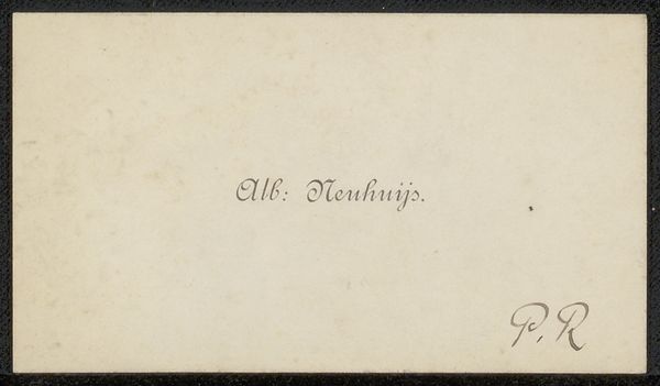 Curator: I find myself utterly charmed by this diminutive print: "Visitekaartje aan Philip Zilcken," a calling card, etched by James Abbott McNeill Whistler between 1867 and 1903. Editor: Immediately, I sense a cultivated persona at play. The refined script, the careful placement of text—it whispers of someone acutely aware of appearances. Curator: Precisely! The artistry elevated the practical. Note the locations, "Cheyne Walk, Chelsea" and "110, Rue du Bac"--two fashionable addresses suggesting a man about town, effortlessly cosmopolitan. It is interesting that there is no “de” or “von” to attach him to his identity more grandly than simply stating his name. Editor: But the etching medium! To me, it speaks of reproduction, availability. Isn’t there a clever tension between the desire to seem unique, individualized, and the mechanical means of achieving that image? As in, it wants to belong to a specific type or class, and be both identifiable, but, still maintain autonomy by stating his name only. Curator: A delightful contradiction! And consider Whistler’s overall artistic project: finding beauty in the everyday. Doesn’t this humble card serve that purpose, elevating the mundane to the realm of art? Editor: It does. The calligraphic flourishes act like personal glyphs, symbolic echoes. Calligraphy itself embodies intent and precision; therefore it’s like seeing into his particularities and motivations. Each curve and line reveals the hand, while simultaneously, potentially concealing other information by way of presentation. Curator: Beautifully put! It reveals yet conceals, a true artistic sleight of hand! Even down to the slightly mottled surface. It invites me to reconsider such throwaway objects that, perhaps, reveal much more than was initially thought. Editor: Exactly. I’m also reminded of the transient nature of relationships – the exchange of such a card being only a momentary transaction of something permanent, or not. To hold such an object in our hands allows us to revisit the original moment through its symbolism, bringing it into focus in our contemporary landscape. It asks of us, how much is performance, and how much is earnest display of being? Curator: Ultimately, it’s a deceptively simple object brimming with layers. It is really lovely to ruminate on the possibilities.