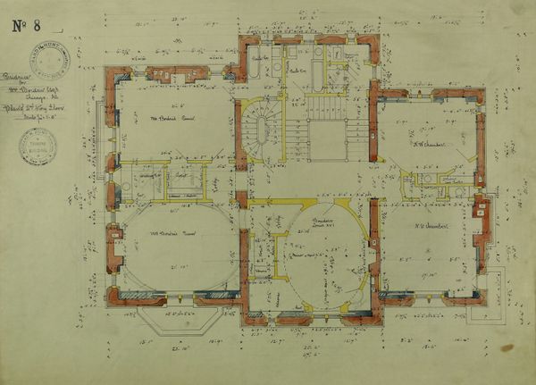 Richard Morris Hunt created this first floor plan for the William Borden Residence in Chicago, likely in the late 19th century. It is composed of architectural precision with delicate lines, a muted palette of orange and yellow hues, and annotations. The plan delineates the layout of a wealthy home, but the linear rendering transcends mere functional representation. The geometric clarity and balance, achieved through the measured arrangement of rooms and corridors, speak to the formal architectural principles that structured Hunt's practice. The warm tones—particularly the orange—accentuate the boundaries of the living spaces, hinting at the materiality of the building's construction, while the pale-yellow tints suggest light and atmosphere. The plan operates as a system of signs, encoding not just spatial relations but also social hierarchies and domestic rituals. The drawing invites us to reflect on how space shapes our lives, imposing order, and inviting new experiences, all through the language of architecture.