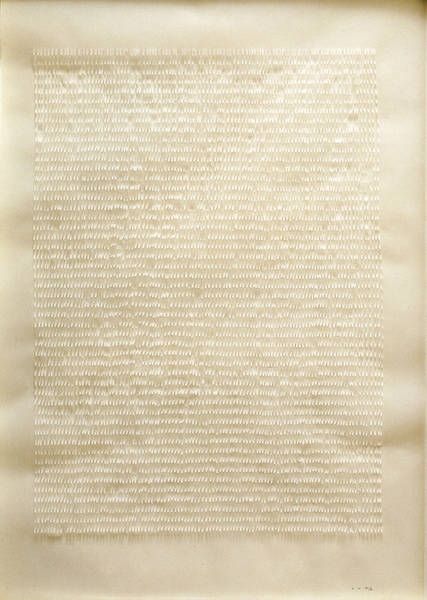 Editor: This is "Canto III" by Esq Tom Phillips. It's an image filled with rows and rows of seemingly identical face-like drawings. The sheer number is striking! What do you make of it? Curator: The repeated, almost mass-produced imagery speaks to the artist's labor and process. Phillips seems to be interrogating the means of production itself. The slight variations challenge the notion of perfect replication, alluding to the human element within a system striving for it. Consider the implications for craft versus industry here. Editor: So, it's not just about the faces themselves, but about the act of creating them, and what that represents? Curator: Precisely. The material becomes a commentary on the social context of its creation, and the relationship between the artist and the work. What's left for you? Editor: That's a new way to look at it, I was so focused on the imagery. Thanks!