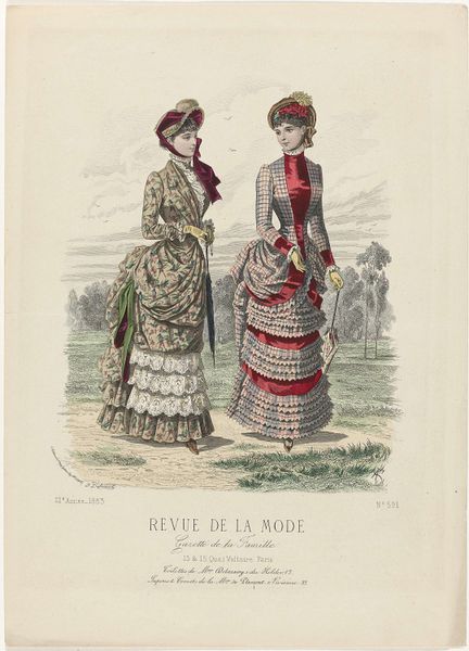 A. Chaillot created this print for the Gazette de la Famille on February 11, 1883, capturing the zeitgeist of Parisian fashion. The print's chromatic intensity immediately seizes the eye, especially the contrast between the vivid blues and soft whites of the dresses. The composition divides the visual field into distinct yet harmonious parts. Note how each figure has a counterpoint in the design and how the fabric’s varied patterns create rhythms across the surface. The floral motifs and ribbon details are not merely decorative but add another layer to the visual architecture of the dresses. It is as if the dresses mirror the discourse of the era. The attention to detail and symmetry subtly hint at the prevailing social codes. Ultimately, this print functions as an archive and a cultural artifact, revealing the intricate relationship between fashion, identity, and societal values of the late 19th century. It invites endless interpretations, reflecting the fluid nature of art itself.