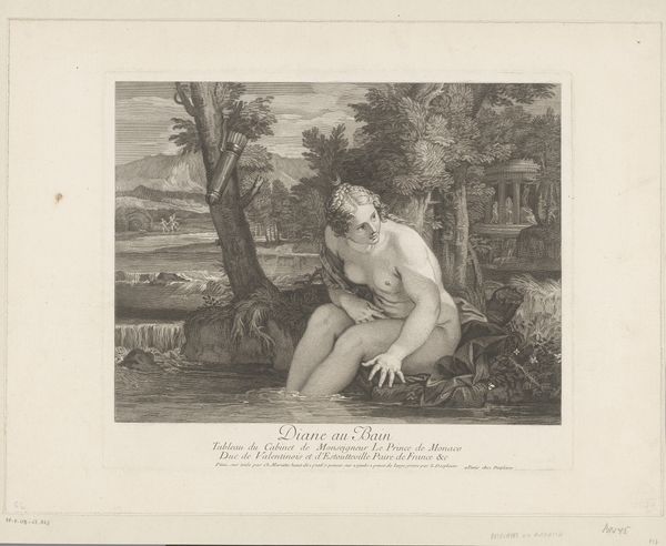 Editor: Here we have Jean Daullé's "Begluurde baadster bij een vijver," an engraving from 1760 currently held at the Rijksmuseum. The bather in the pond, with a lurker nearby, has a voyeuristic undertone... what's your reading of the image? Curator: It's fascinating how Daullé captures the cultural gaze of the time. Consider the act of observing as itself a potent symbol. The voyeur represents, perhaps, the audience's own position. The presence of the river god is also telling: notice how he lurks amongst reeds – symbols of the natural world and perhaps of uncontrolled instincts. Is this a warning or an invitation? Editor: So the act of observation isn't a passive one? Is there a comment on the nature of power relations or something? Curator: Precisely! Think about it: in whose gaze does beauty reside? Is it the bather, aware of the river god, playing into a staged sensuality? Or is it for the unseen observer? This work evokes older imagery—Diana and Actaeon—while subverting traditional interpretations of virtue and vice, knowledge and power. What emotional reaction did you have toward the two figures here? Editor: The river god makes me uneasy, like an unwanted gaze. The bather’s beauty seems to invite looking while I also find his lurking creepy! Curator: It is a purposefully uncomfortable dynamic, meant to mirror how beauty can be both idealized and weaponized as an object of manipulation. Editor: This changes the way I appreciate Daullé’s composition so much: how we are positioned, how it asks us to engage as the knowing and unknowing, empowered viewers, complicit maybe... Curator: It prompts us to consider how symbols of power and voyeurism persist. We are still entangled in its questions!