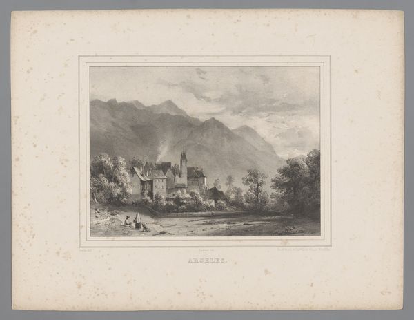 Editor: This is "Gezicht op Pfäfers en het klooster van Pfäfers" by Joseph Maximilian Kolb, sometime between 1834 and 1893. It's a print, very detailed. There's such a serene atmosphere to it... How would you interpret this work, its calm beauty? Curator: Calm beauty indeed. It reminds me of those hushed moments just before dawn, you know? That anticipatory stillness. Look closely at the textures – the gentle hatching creates form from subtle gradations of light and shadow, giving almost a sense of tangible mist hanging over the landscape. It's so evocative. What about the relationship between the built environment and the natural landscape? Anything strike you? Editor: I guess how harmoniously the buildings seem to blend in... they are almost nestled into the hills. Curator: Precisely! There's no jarring contrast, no visual dominance. It suggests a society living *with*, not *against*, nature. And what about that lone figure in the foreground? They're part of this peaceful vista. Do you think they're essential to the picture or almost a distraction? Editor: I hadn't thought about it that way. I suppose it adds a bit of everyday reality, otherwise it could be purely idealized? Curator: Perhaps. Art's funny that way, isn’t it? It’s a mirror reflecting not only the artist's eye but our own perceptions and even cultural biases. I like how you picked up on that. It also hints at the size of this world versus any one person in it. What do you make of the old engraving style? Editor: Well, now I feel I see it in a new, more intimate light. I came expecting history but it gives more of an eternal landscape. Curator: It has been my pleasure.