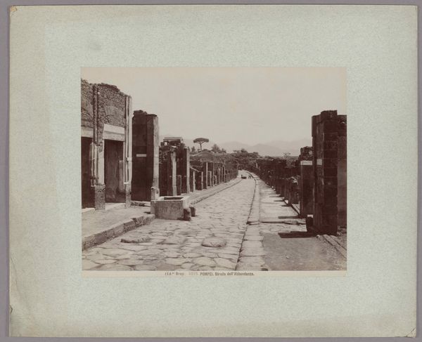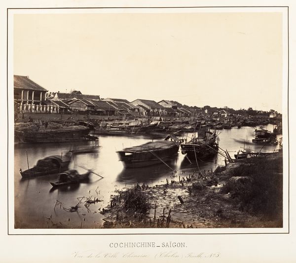 Curator: Hippolyte Arnoux’s "Quai de Port Said, Egypte," created sometime between 1860 and 1891 using the albumen print method, presents a captivating view of a bustling waterfront. Editor: The sepia tone lends an air of antiquity. There is something immediately compelling about the repetition of the boats against the rhythmic facades of the buildings. Curator: The strength of the composition truly resides in its subtle division of space, marked vertically from left to right with gradations from urban density to open water, and marked horizontally from the depth of the horizon. A semiotic analysis suggests the tonal range reinforces the transition from a detailed built environment to atmospheric openness. Editor: Precisely! It's not just the compositional structure, but also the symbolism. The boats, arrayed along the quay, almost line up to spell 'departure.' One might associate them with travel and connection across different worlds during the age of colonial exploration. I wonder what cargo these vessels were transporting at that time? Curator: That intersection is central, and suggests a meeting place of structure, whether temporal or spatial, that defines a zone of connection. Arnoux understood the communicative potential latent in the photographic medium; the choice of perspective, the sharp focus, the controlled tonal values. All indicate that this work intends not just a depiction, but an assertion about modern life as a dynamic system. Editor: Indeed. And looking closely, I observe what looks like several people on the docks, rendered like hieroglyphs amidst the built architecture of a city emerging in significance. It seems they symbolize human endeavor, and how the daily pursuits of its local people shape a place that straddles history, progress, and potential. Curator: I find the objective clarity presented through the albumen print to reinforce a modernist ethos centered on precision and technical rendering, creating meaning by showing. Editor: Which leaves the photograph open for the future, allowing future audiences to see and construct for themselves what those symbols tell about cultural expansion. Ultimately, that tension makes this piece more engaging and, dare I say, timeless.