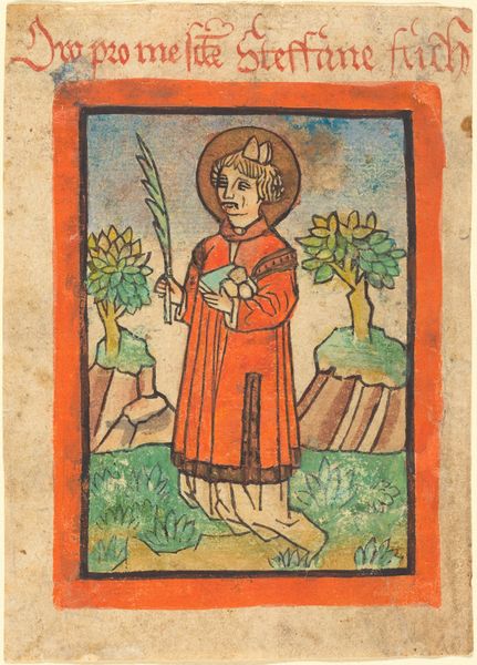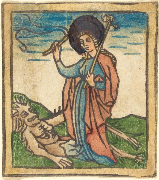 Editor: So here we have "Saint Margaret," a print using watercolor and colored pencil from somewhere around 1480 to 1490. What strikes me immediately is the miniature scale and vibrant color, it feels both delicate and powerful. The Saint just casually holds the cross while standing on a defeated dragon. What do you make of it? Curator: Ah, Saint Margaret! To me, it whispers tales of courage, doesn't it? Imagine a time when dragons weren't the lovable rogues of children's books, but representations of the darkest fears. She literally treads on fear, armed with her faith. Editor: It's funny to think that dragons were once that scary! Do you think this piece was meant to be encouraging or a bit preachy, even? Curator: Preachy, maybe. But mostly I feel it’s encouragement, dressed up with a story! She looks pretty unfazed about that dragon too, it really makes you wonder about the strength it suggests, about overcoming adversity even when life looks...scaly! Editor: Definitely makes me rethink medieval art beyond tapestries and grand portraits. This feels so intimate. Curator: Exactly! And it proves that sometimes the smallest artworks pack the biggest symbolic punch. What a story she carries within this tiny frame! Editor: I will look at miniature artwork very differently moving forward, thinking about storytelling and courage. Curator: As will I! And you've made me think that dragons deserve a little more credit for their symbollic evolution, perhaps they merely need a hug.