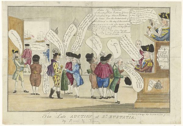 Editor: This is "Etalage van uitgever Thomas Tegg te Londen," a watercolor print made after 1819 by Thomas Rowlandson, currently housed at the Rijksmuseum. It has a distinctly satirical and exaggerated feel to it. I’m curious about the context in which such a work was created. What’s your take on this, considering the socio-political scene of the time? Curator: This print reflects the rise of caricature and its increasingly important role in shaping public opinion and challenging authority in the early 19th century. Rowlandson's image satirizes Thomas Tegg, a London publisher known for his popular, often outrageous, caricatures. Editor: So Tegg himself is being lampooned? Curator: Exactly! Notice the prominent display of "Apollo Library" and the shelves brimming with prints. This points to the burgeoning market for such imagery, catering to a growing literate middle class. How do you think this accessibility impacts the cultural significance of caricature? Editor: It democratizes art in a way, making social commentary readily available, which may empower more people. Curator: Precisely. The flying figure and the phrase "Tail Piece to Volume Three" also indicates the serialized nature of some of these prints, contributing to ongoing dialogues and debates. It’s not a one-off; it’s part of a larger cultural conversation. The depiction of the public consuming these images is vital. This reflects an active and engaged audience shaping the artwork's cultural impact. The caricature shapes society, but so too does society shape caricature. Editor: That makes a lot of sense. Seeing the context as a dialogue instead of a simple creation adds new meaning. I never would have thought about all of the cultural implications in distribution just from viewing this print. Curator: And understanding that broader conversation really illuminates the layers of meaning within this seemingly simple, even humorous, image.