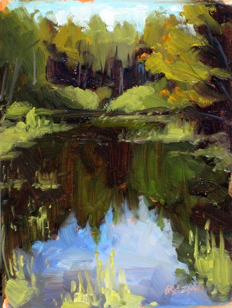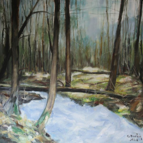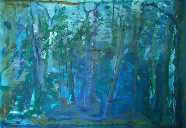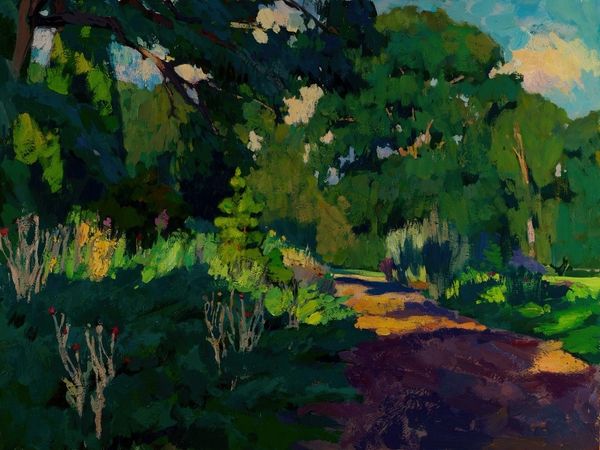 Editor: This is Robert Henri's "Under the Trees - Monhegan," painted in 1918. The oil paint gives this scene such vibrancy, almost an electrifying jolt through the trees. What strikes you when you look at it? Curator: The interplay of light and shadow is key. Notice how the brilliant, almost primordial, yellows push against the dark, silent trunks of the trees. Light in forests often carries spiritual connotations of rebirth or awakening, reflecting the psychological need for revelation. Henri's expressive brushstrokes deepen that impact, wouldn't you say? Editor: Definitely, the brushstrokes are very visible. Is there significance to the choice of Monhegan as a setting? Curator: Absolutely. Monhegan, like many artist communities, functioned almost like a utopian space. It fostered artistic freedom, particularly in the plein-air tradition. The forest there takes on a new life as a place of introspection and almost mystical experience. I would say that there is the impressionistic element here as it reflects both personal experience of an era, but the emphasis leans on symbolism through color and composition. Do you feel a sense of tranquility, despite the bold colors? Editor: That’s interesting – tranquility is not the first thing that comes to mind. There’s something almost anxious about the stark contrasts, that’s the lasting impression. Curator: Indeed. The expressionist landscape is charged, not passively reflecting the scenery, but actively reshaping it. It seems that Monhegan wasn't always quietude, perhaps hinting to a silent undercurrent of unrest? Editor: I never considered that interpretation of expressionism. Curator: Hopefully it provided an introduction into looking at the artist in conjunction with their setting to gain insights into an otherwise, natural experience.