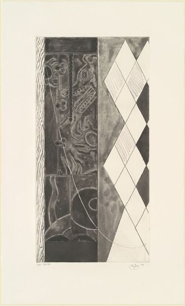 Jasper Johns created this print, whose title is Untitled [4th state], using etching, aquatint, and drypoint. Johns emerged as an artist in the 1950s, a period marked by Cold War anxieties and shifting social norms. His work, often associated with Neo-Dada and Pop Art, challenged the dominance of Abstract Expressionism by reintroducing recognizable imagery. In this print, Johns divides the composition into distinct yet interconnected zones. One area features what appears to be a collection of personal or symbolic motifs, rendered in dark, textured lines. The other displays a pattern of diamonds, their surfaces varying in tone and texture. These motifs evoke a sense of layered meaning. Johns has said he is interested in "things which are seen and not looked at." The print invites us to consider the interplay between personal expression and cultural symbols, while suggesting the artist's quest to find meaning in the everyday.