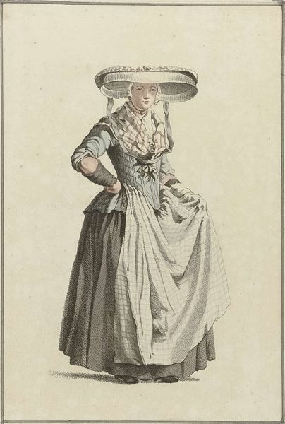 Curator: This print from 1784, titled "Marie Antoinette: The Queen of Fashion: Gallerie des Modes et Costumes Français", offers a snapshot of elite fashion during the late 18th century. Editor: It strikes me as deceptively simple. The lines are delicate, almost airy, but that enormous dress...it speaks of such opulence and the intensive labor involved in creating something so voluminous. Curator: Precisely. It’s a watercolor and pen drawing, and its existence points to the burgeoning fashion industry of the time, one dependent on detailed depictions disseminated as print. Consider the scale of the textile production necessary to fuel this kind of fashion. Editor: The artist, Nicolas Dupin, seems focused on capturing the texture of the fabrics, from the ruffles at the neck to the ribbon accents and the sweeping skirt. The attention to detail invites scrutiny. Were such garments mass-produced or were they strictly bespoke at this time? Curator: These "Gallerie des Modes" prints functioned much like fashion magazines do today, dictating trends to a consuming elite. And this was before industrial looms fully transformed textile production. Much of what you see here depended on skilled hand labor, further cementing class divisions. Editor: I'm particularly interested in how Marie Antoinette used fashion as a political tool, both to assert her power and to cultivate a certain image. It feels somewhat radical in this image due to her style choices that deviate from the expectations from royal figures. Curator: Absolutely, these prints both document and participate in that construction of image. They fueled public fascination and scrutiny, while normalizing increasing excess—excess that, of course, contributed to the discontent simmering beneath the surface of French society. Editor: A seemingly innocent fashion plate, brimming with so many complicated material and political realities. Curator: It's a reminder that even seemingly superficial objects can be incredibly rich sources for understanding the past. Editor: Indeed, every frill and fold speaks volumes, it's time to dive deeper in other artworks from the collection!