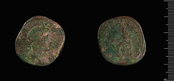 Curator: Let's discuss this sestertius, a bronze coin of Philip I, the Arab, currently held in the Harvard Art Museums. The coin weighs 15.11 grams. Editor: Immediately, I'm struck by how much history this small artifact holds. It's worn, but I imagine it holds incredible symbolic weight. Curator: Exactly. The coin's materiality—the bronze itself, the process of its minting—speaks to the Roman economy and the emperor's control over resource extraction and labor. Editor: And that portrait! What symbols were intentionally chosen to portray Philip I? It tells us how he wanted to be perceived, and what aspects of his rule he wanted to emphasize. Curator: Indeed, the imagery would have been deliberately chosen. But it's also crucial to consider how mass production and distribution of these coins fostered a collective identity and reinforced social structures throughout the Empire. Editor: Fascinating. It really opens the mind to so much more than just monetary value. Curator: Precisely. A material object reflecting power dynamics! Editor: And symbols, etched in metal for millennia.